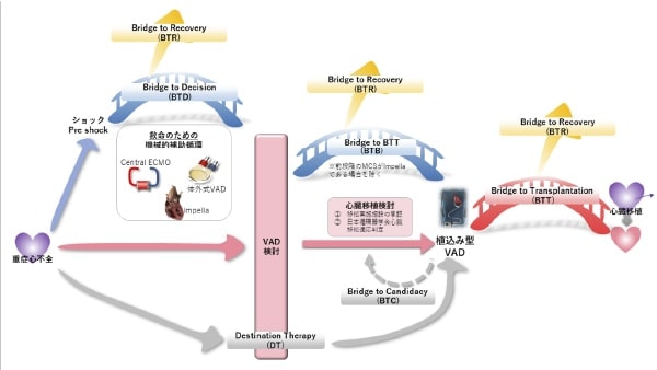 重症心不全の中でも最大限の薬物治療や冠動脈疾患への血行再建、弁膜症への外科的・カテーテル治療、不整脈治療や心臓再同期療法も無効、もしくは適応がない場合には、末期心不全状態として心臓移植治療を検討します。心臓移植治療は、登録時に65歳以下と年齢の制限があります。また、本邦においては、心臓移植適応判定から心臓移植まで長期の待機期間を要することから、多くの方は左室補助人工心臓(LVAD)を用いて待機を行います。このように、心臓移植への橋渡しとしてLVADを使用する場合をBridge-To-Transplant (BTT)といいます。一方で、移植医療を目的としないLVAD治療をDestination Therapy(DT)と呼びます。